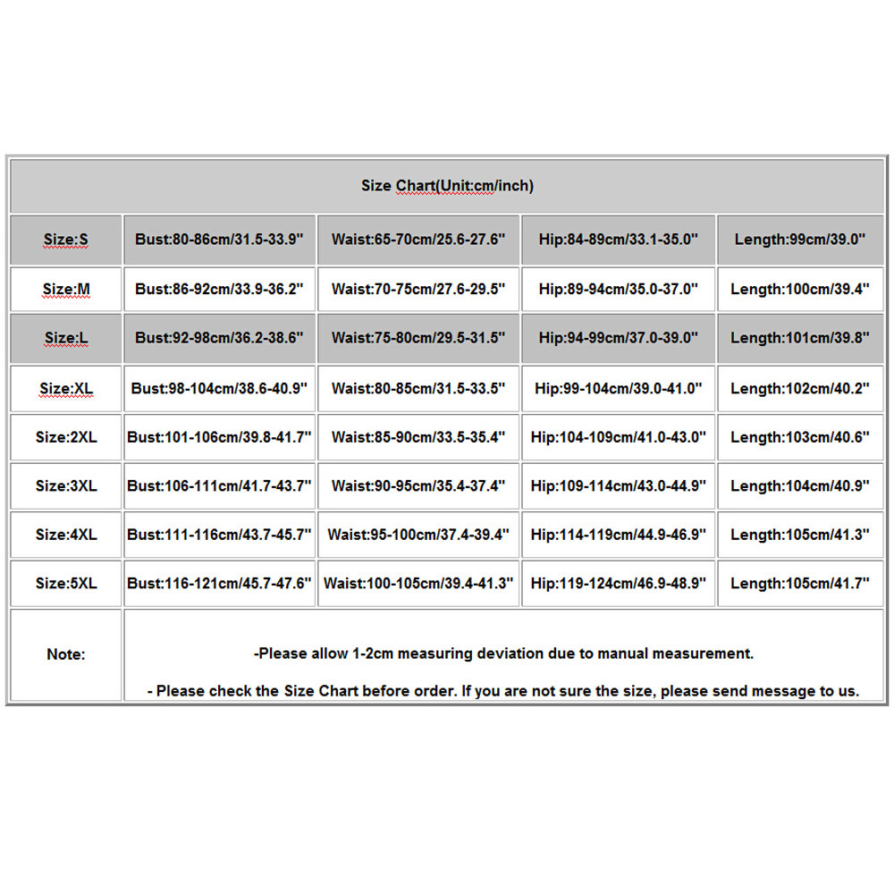 | Size:2XL | Bust:101-106cm/39.8-41.7″ | Waist:85-90cm/33.5-35.4″ | Hip:104-109cm/41.0-43.0″ | Length:103cm/40.6″ |
