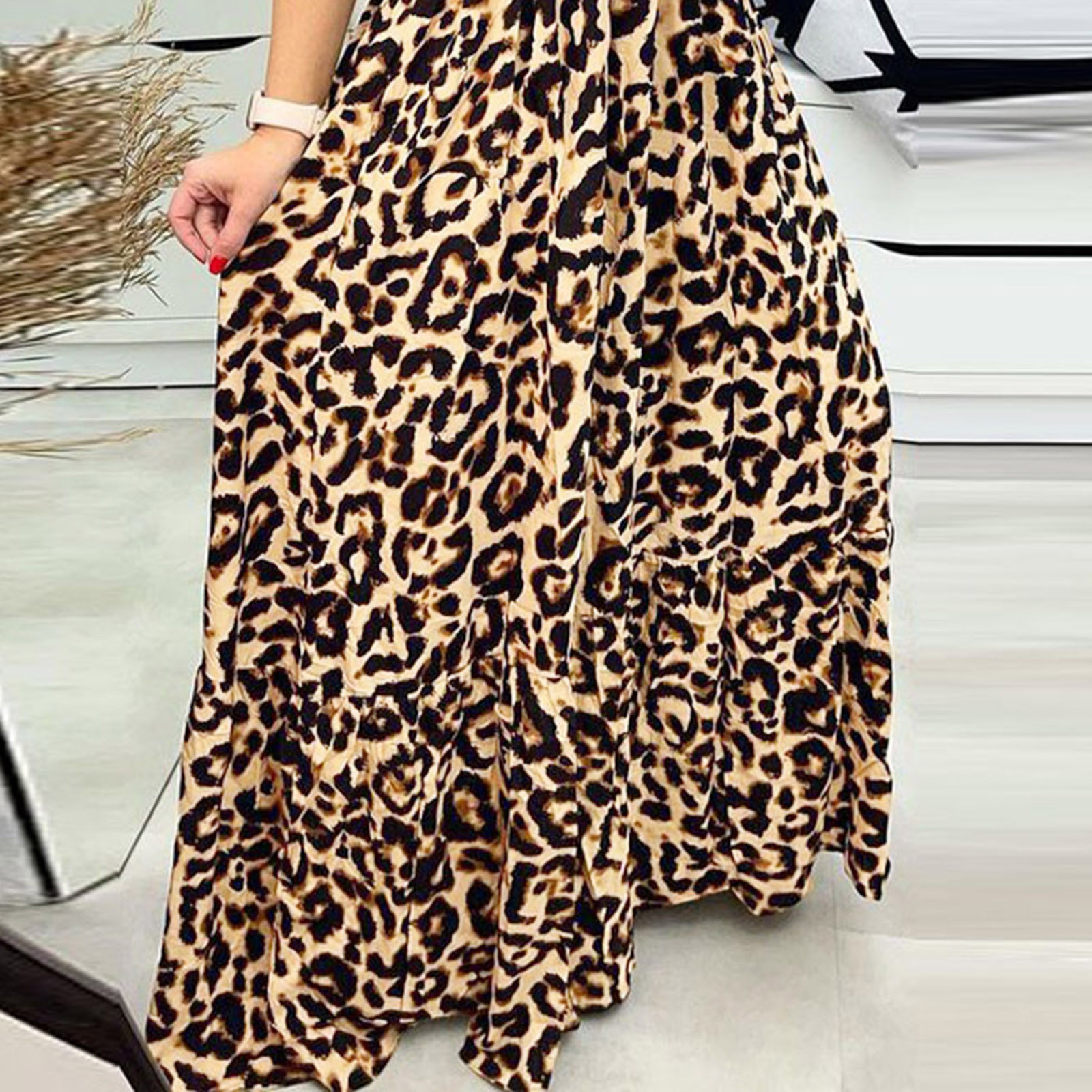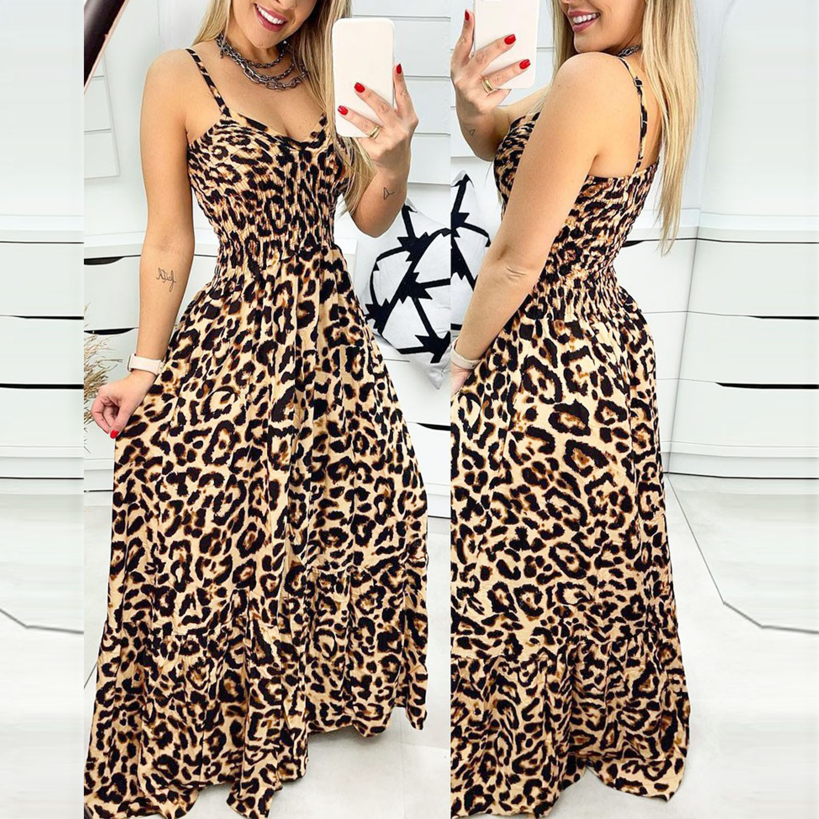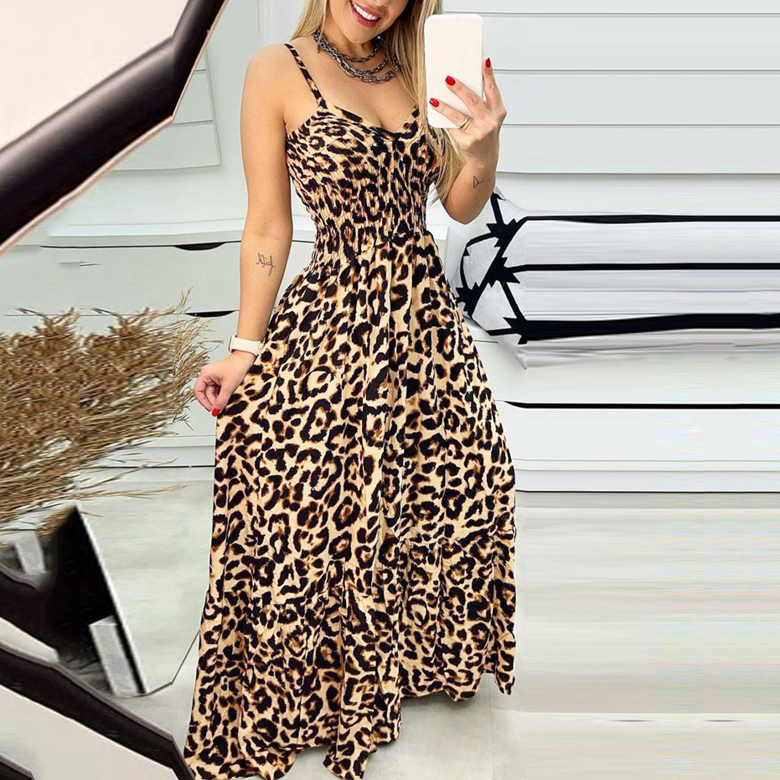Women Daily Summer Casual V Neck Sleeveless Pullover Dress Leopard Print Elasticity Shirred Cami Maxi Dress