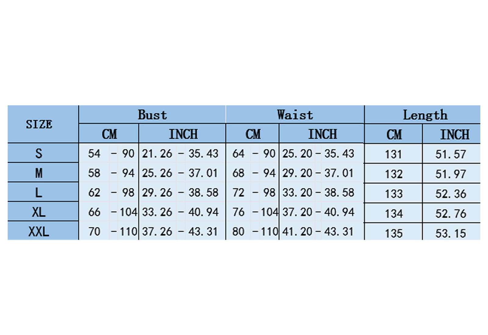 | Size | US Size | UK Size | EU Size | Bust | Waist | Length |