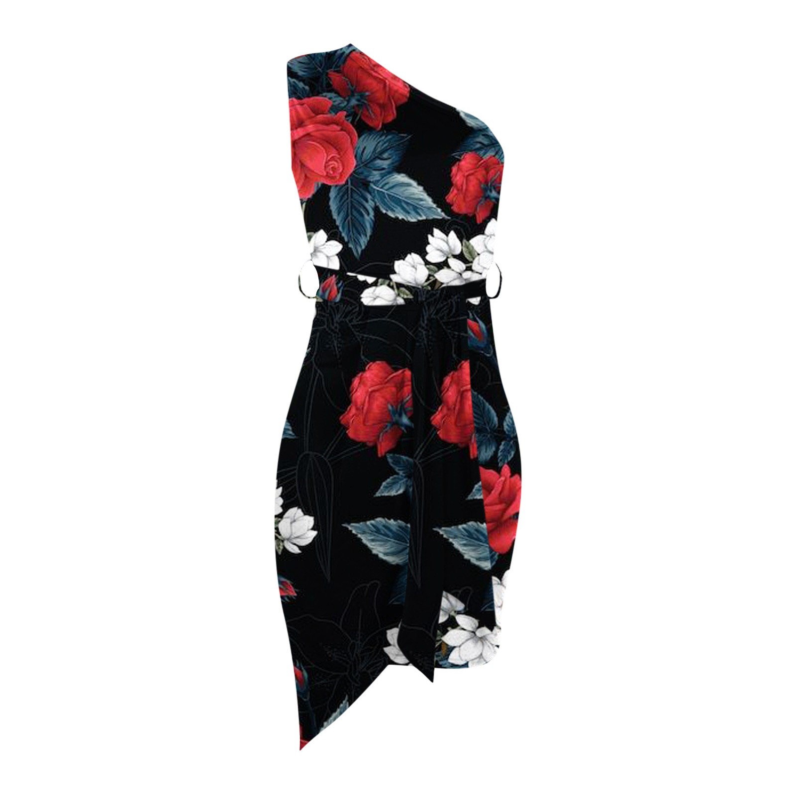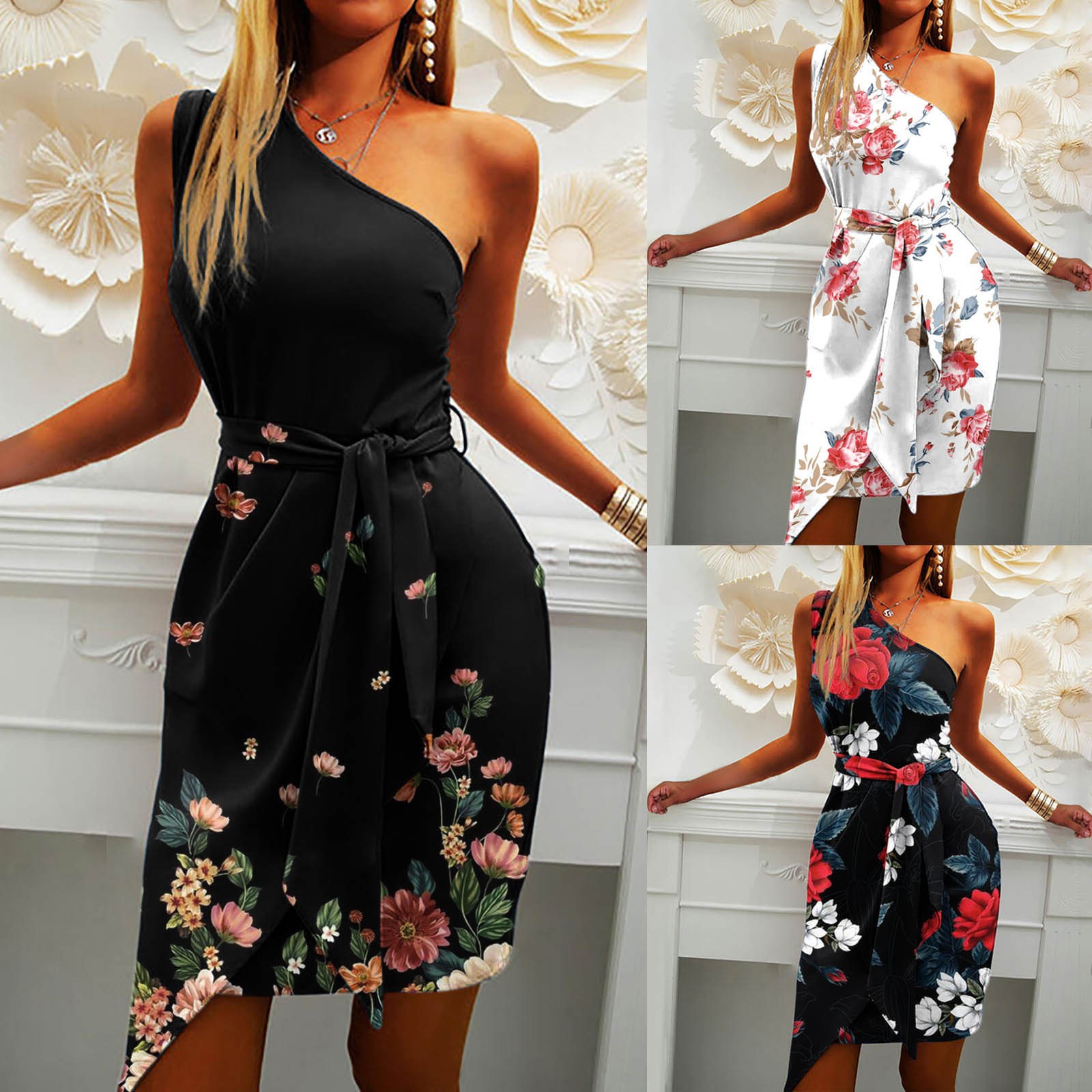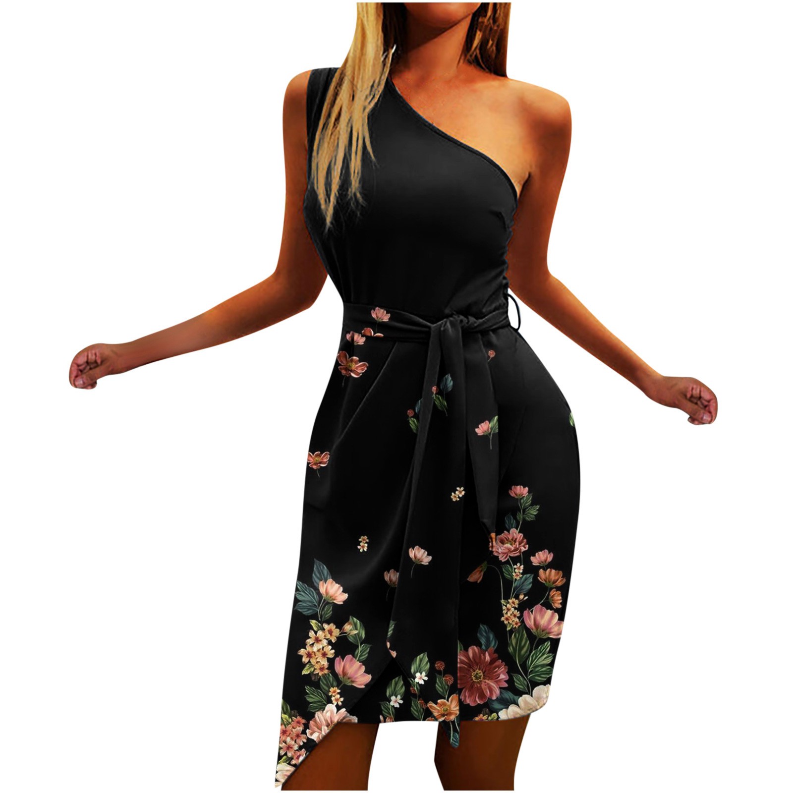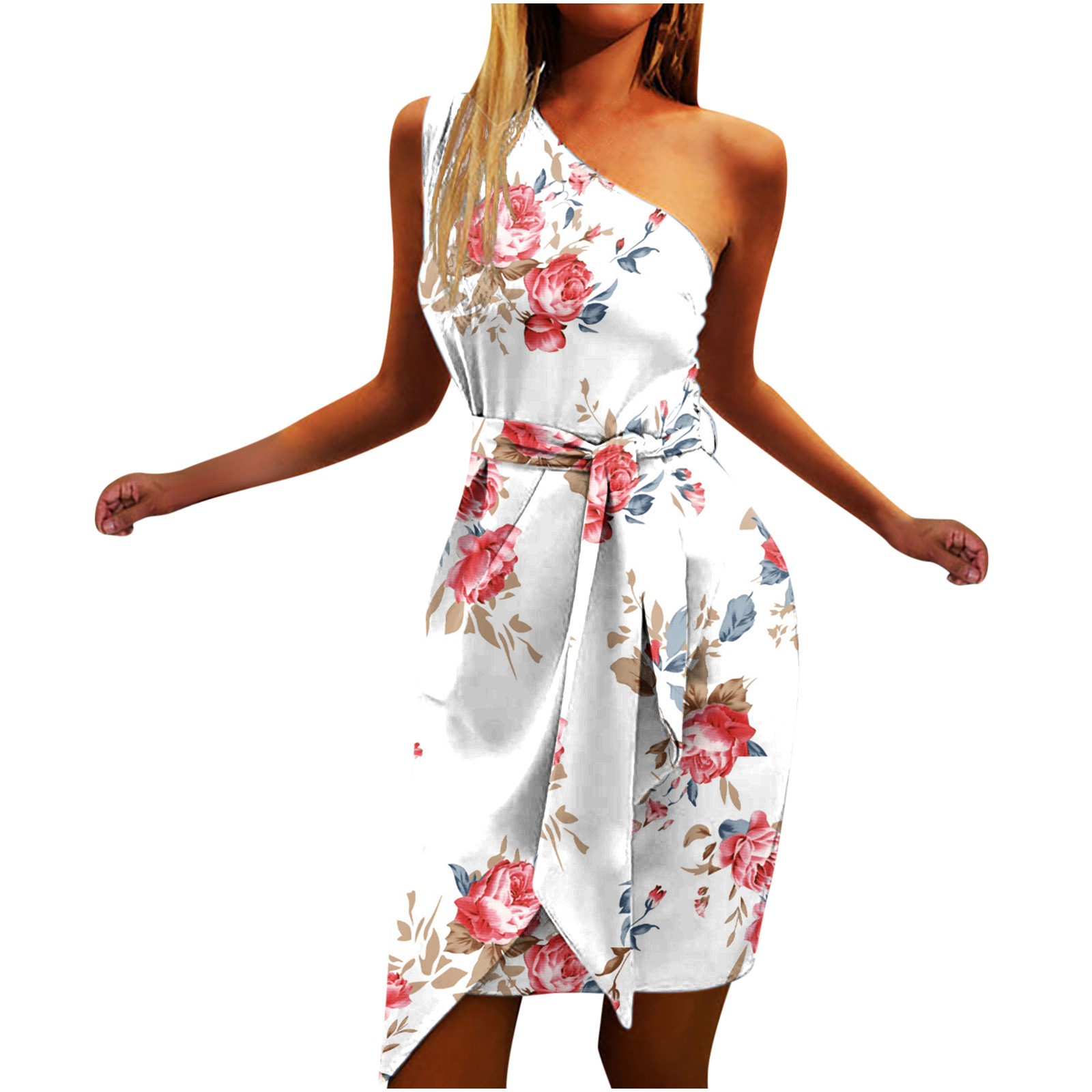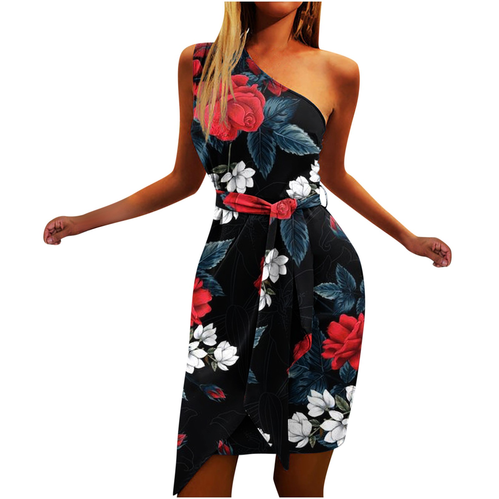 Women Summer Casual Slanted Shoulder Cropped Floral Print Slim Dress with Belt