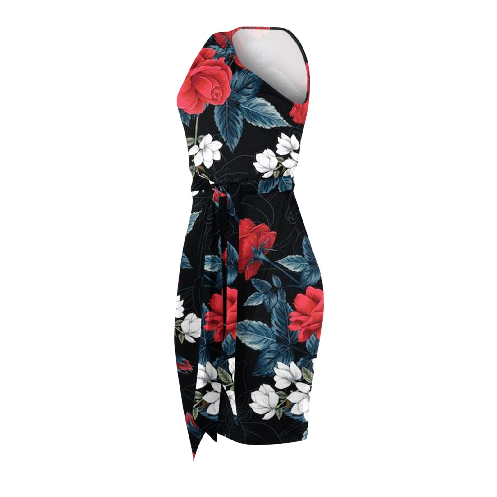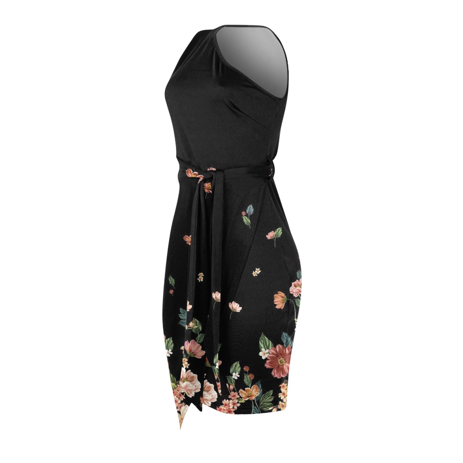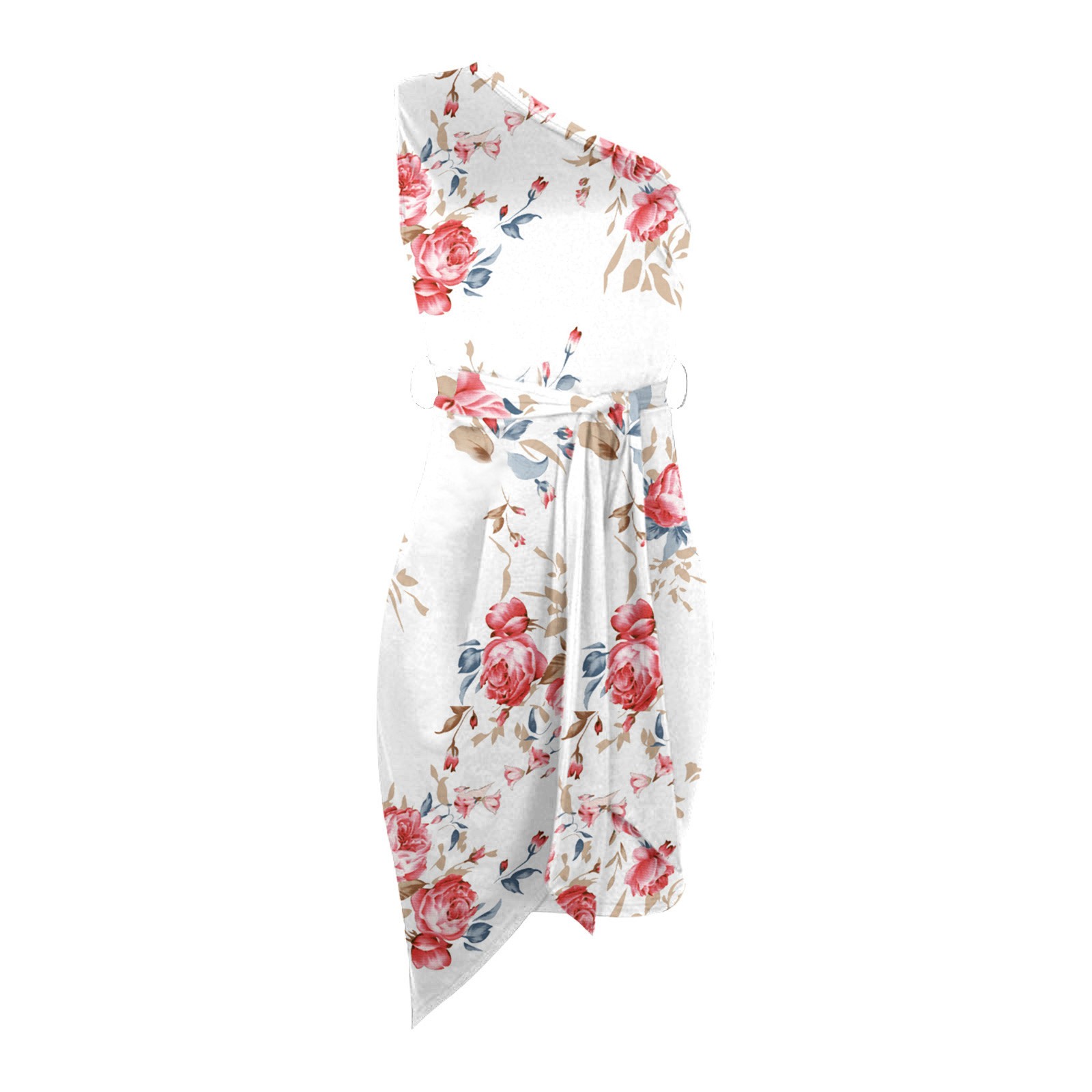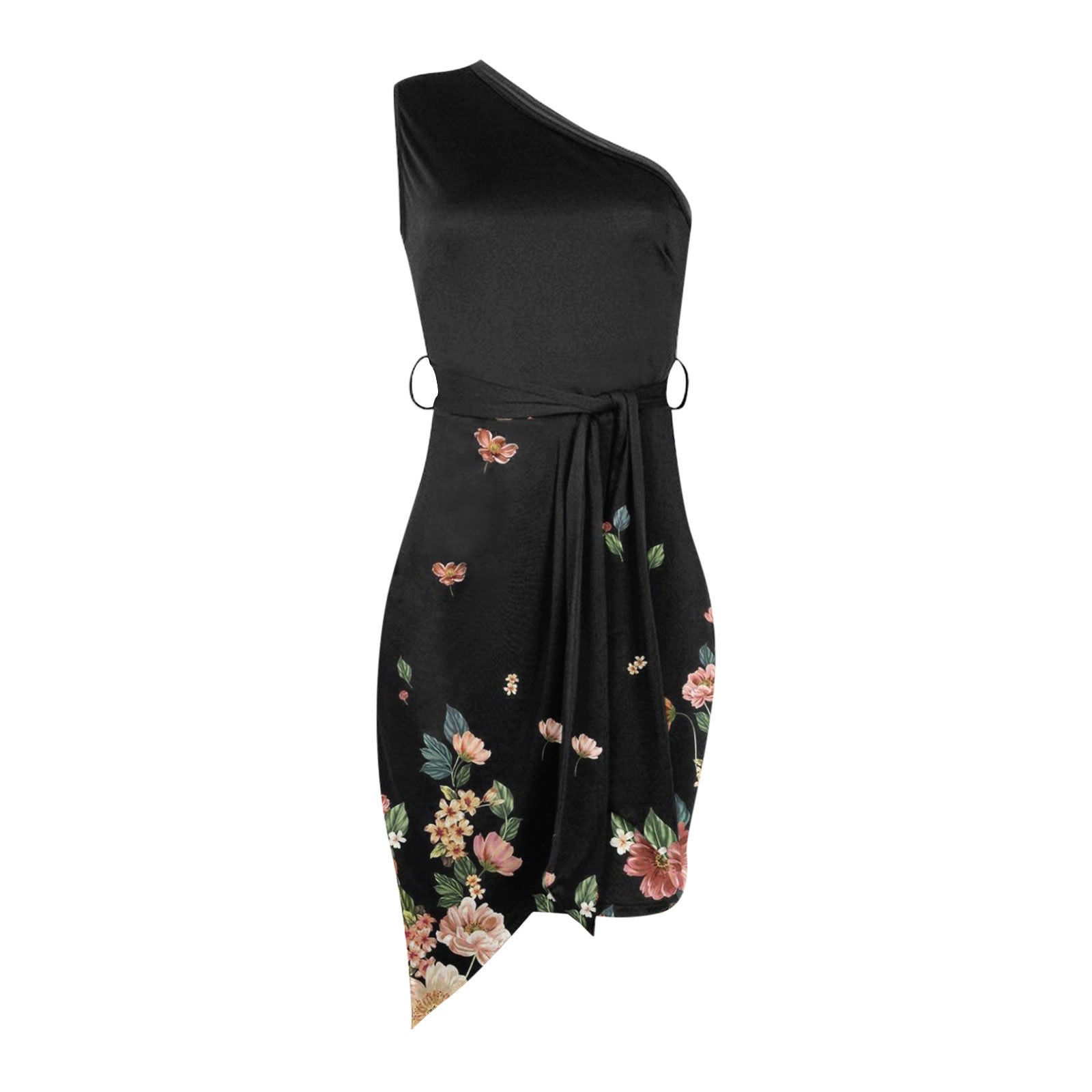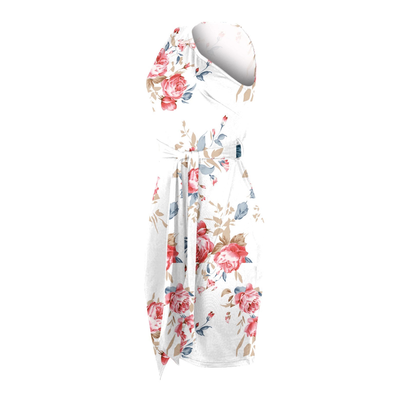Women Summer Casual Slanted Shoulder Cropped Floral Print Slim Dress with Belt