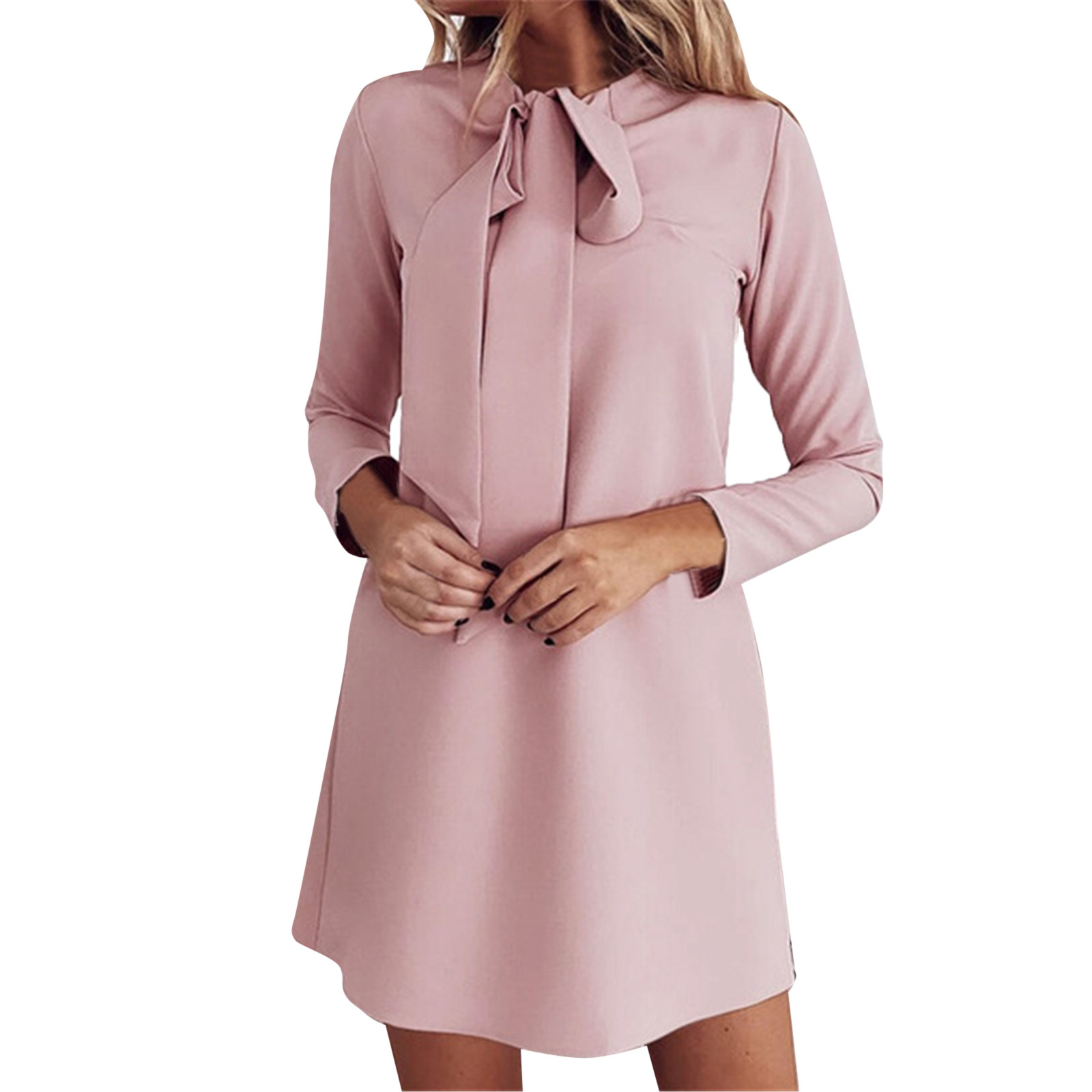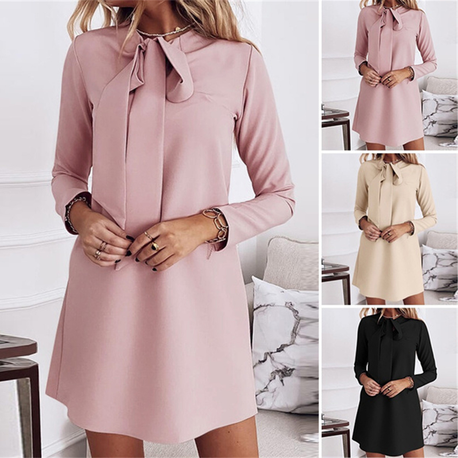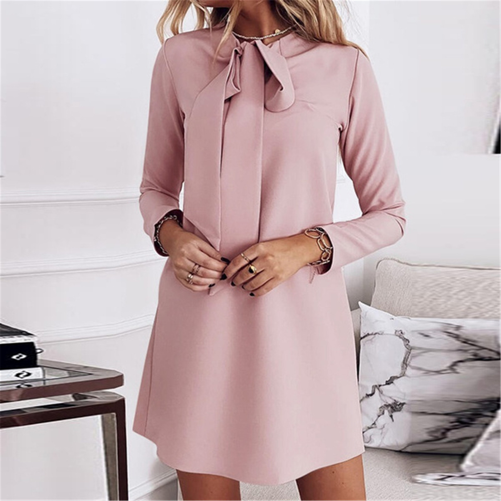 2022 Women Fashion Solid Color Bow Tie Long Sleeve V Neck Knitted Knee Length Dress
