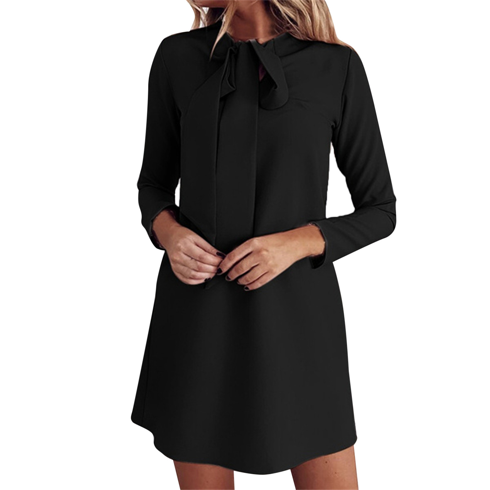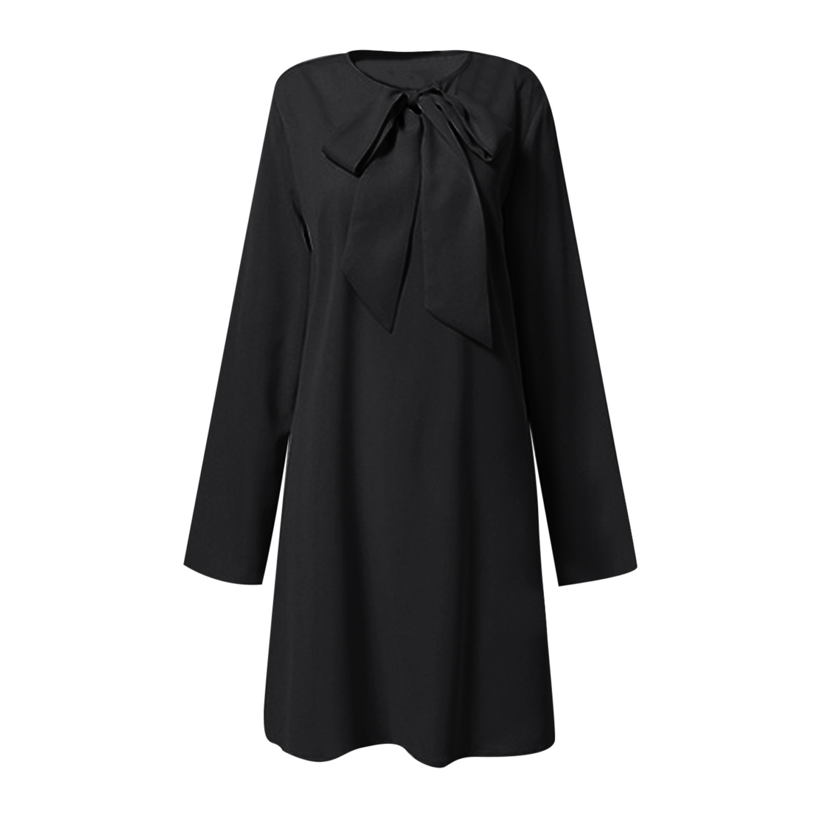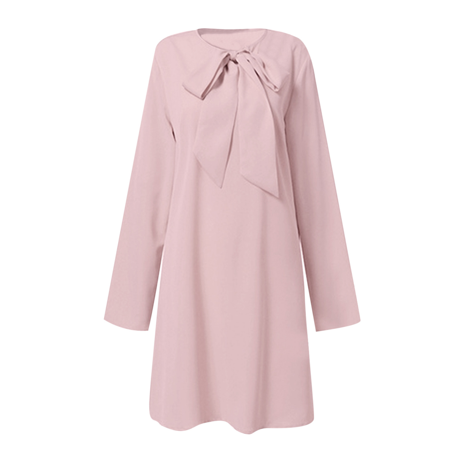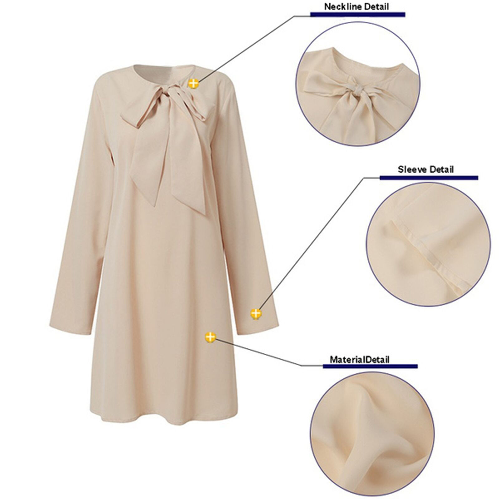 2022 Women Fashion Solid Color Bow Tie Long Sleeve V Neck Knitted Knee Length Dress