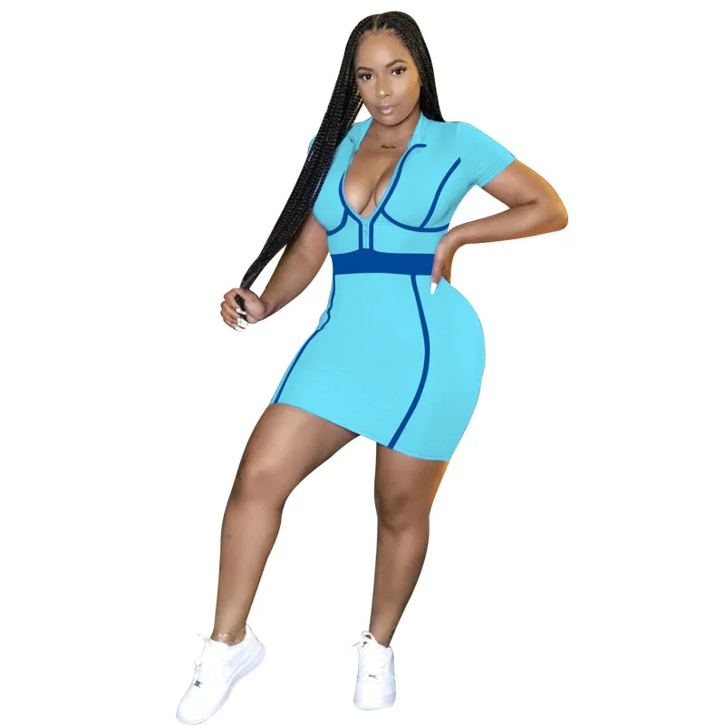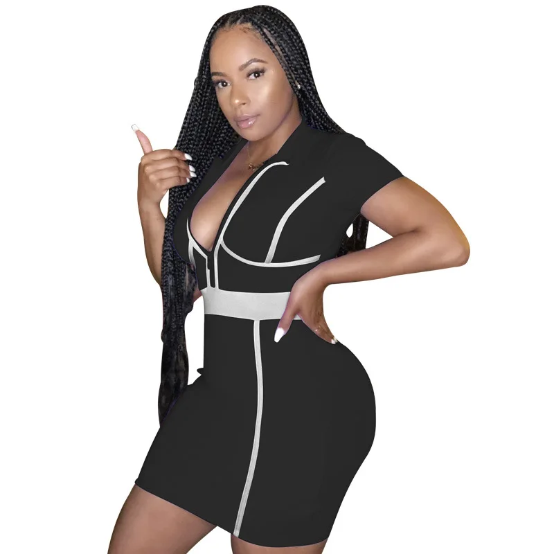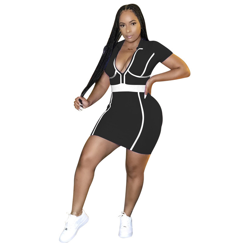 Women Summer Black Blue Short Sleeve Patchwork Zipper Up Bodycon Midi Mini Dress Sport Moto Biker Pencil Night Club Dresses S-2X